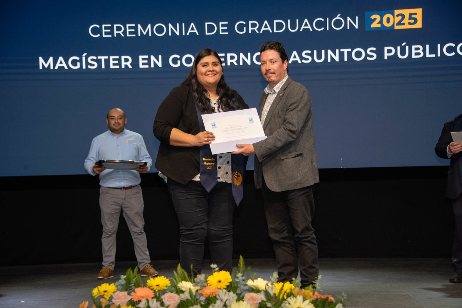 Durante la ceremonia, también tuvieron espacio las voces de los y las estudiantes. Soraya Sanzana, egresada del Magíster en Gobierno y Asuntos Públicos, compartió su experiencia. “Este programa me entregó herramientas para una comprensión profunda de las políticas públicas, especialmente en el área de salud. Elegí salir de mi zona de confort como enfermera para ampliar mi visión y aportar desde nuevas perspectivas”, relató emocionada.