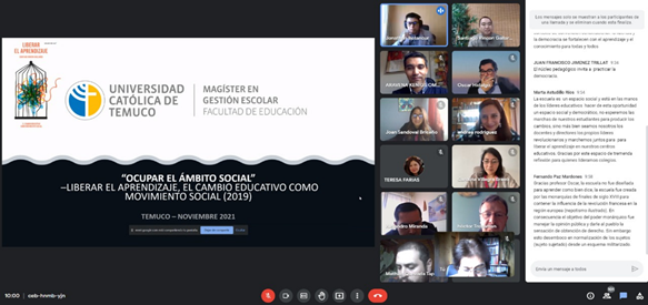 El día sábado 13 de noviembre a las 9:00 horas, Andrea Rodríguez Venegas, Jonathan Betancur Álvarez, estudiantes del Magíster en Gestión Escolar y Oscar Hidalgo Muñoz, egresado del Magíster, expusieron en el seminario “Liderar para Liberar el Aprendizaje” en compañía del invitado internacional Dr. Santiago Rincón-Gallardo, autor del libro “Liberar el Aprendizaje: El cambio Educativo como Movimiento Social”.