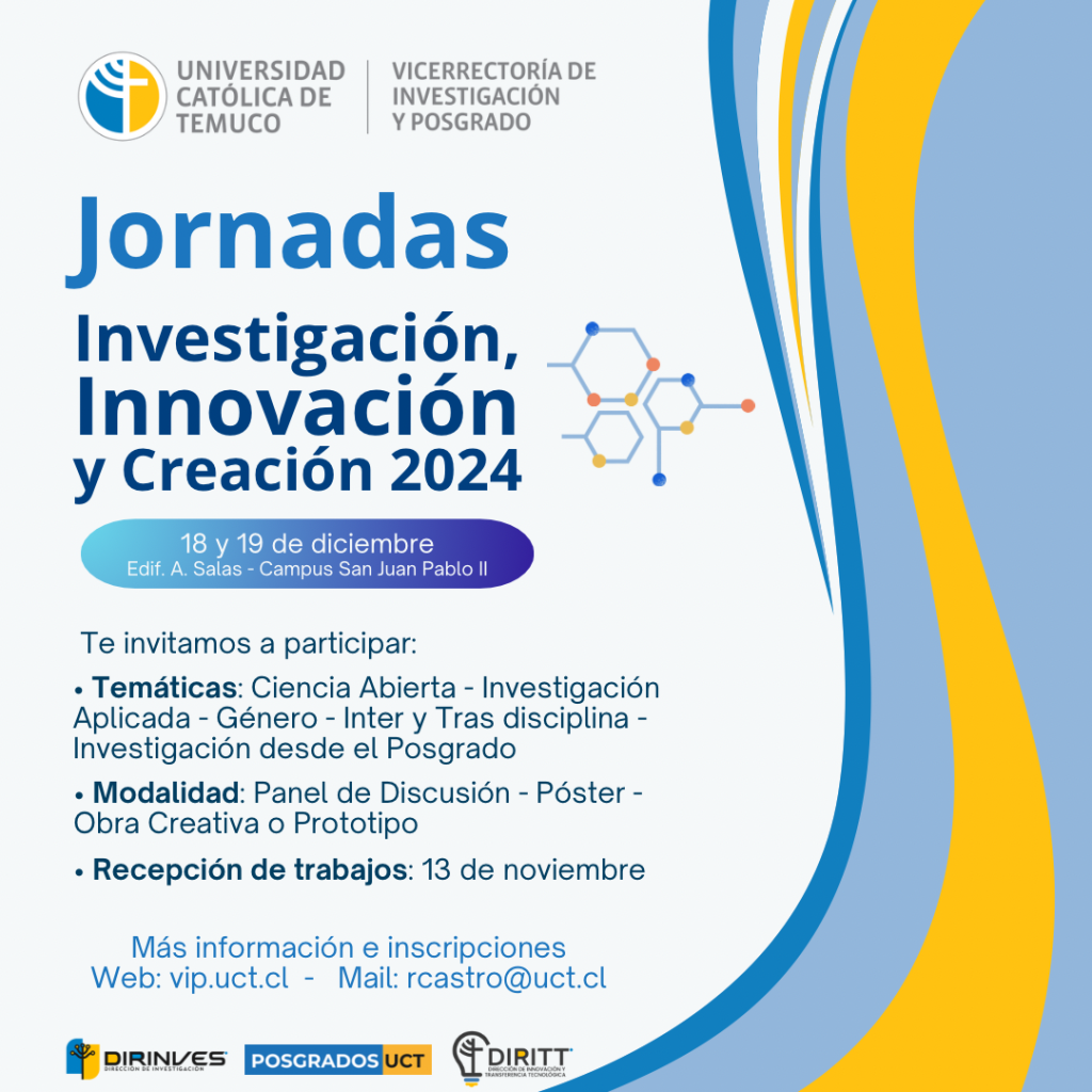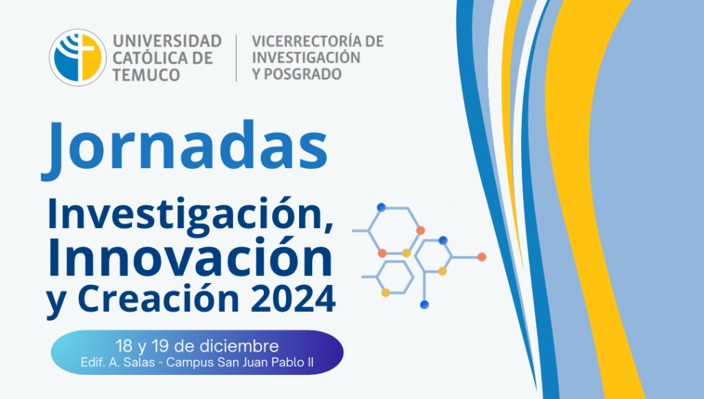 La Vicerrectoría de Investigación y Posgrado, en conjunto con las direcciones de Investigación e Innovación y Transferencia Tecnológica y la Escuela de Posgrado, invita a toda la comunidad académica de la Universidad Católica de Temuco a participar de las Jornadas de Investigación, Innovación y Creación 2024, que se llevarán a cabo los días 18 y 19 de diciembre de 2024, en el Campus San Juan Pablo II, Edificio Adalberto Salas.