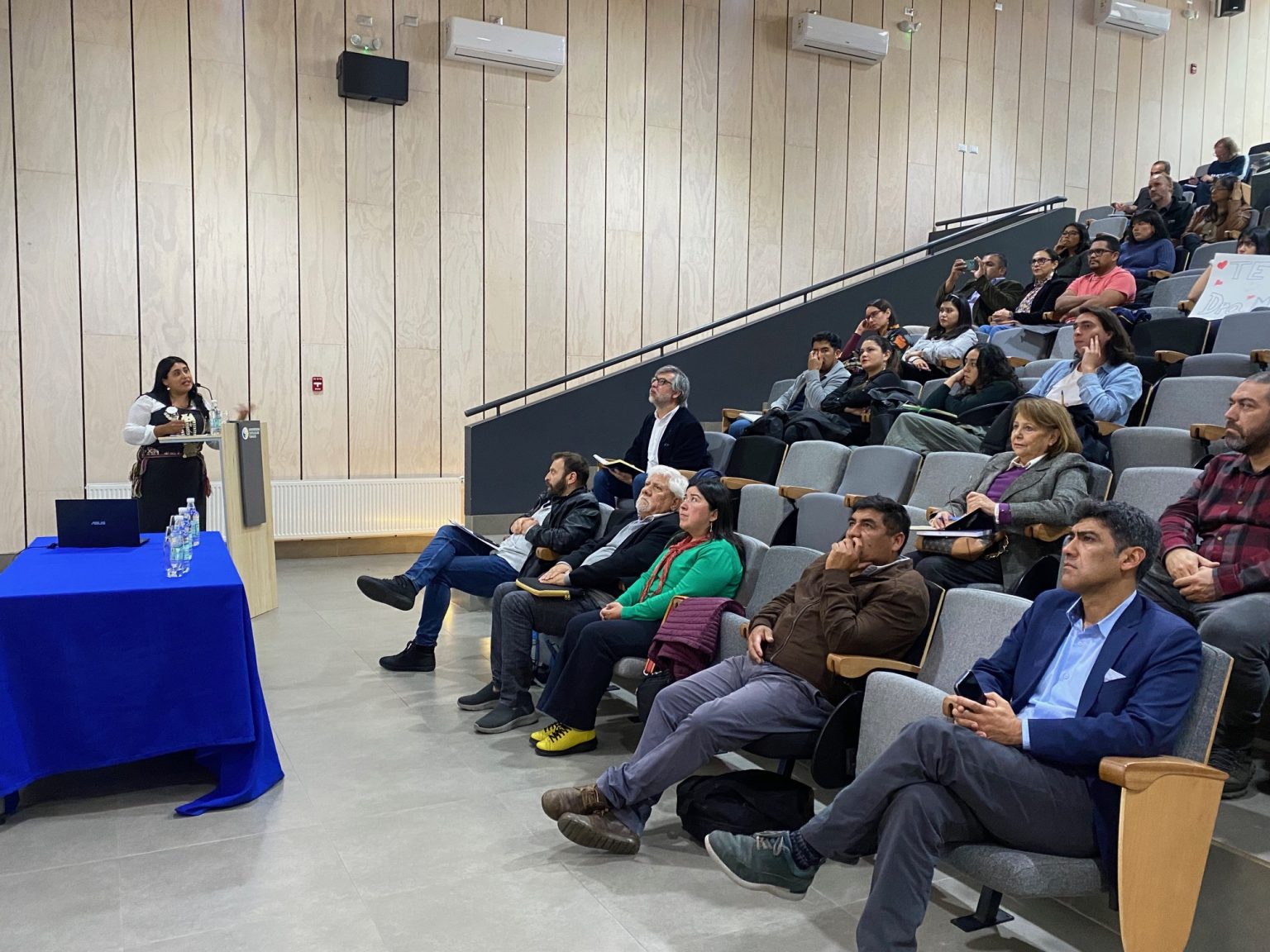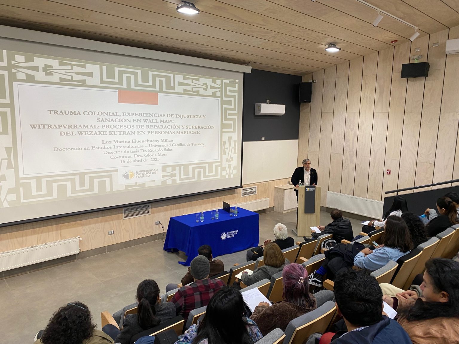 La presentación pública de la tesis doctoral contó con la presencia del Director General de la Escuela de Posgrado, Dr. Gonzalo Díaz Crovetto; el Decano de la Facultad de Ciencias Sociales y Humanidades, Dr. Juan Carlos Arellano González; el Director del Programa de Posgrado en Estudios Interculturales y profesor guía, Dr. Ricardo Salas; en forma telématica la cotutora, Dra. Gloria Mora y evaluador externo Dr. Juan Francisco Salazar de la Universidad Western Sidney University; académicos de la UCT, integrantes de la comunidad universitaria e invitados especiales del mundo mapuche.