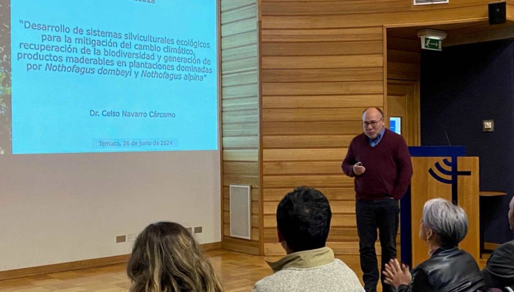 Con la participación de la Seremi de Ciencias de la Macrozona Sur, Maite Castro, se realizó el seminario de cierre del proyecto FONDEF IT21I0028 “Desarrollo de Sistemas Silviculturales Ecológicos (SSE) para la mitigación del cambio climático, recuperación de la biodiversidad y generación de productos maderables en plantaciones dominadas por Nothofagus dombeyi (coigüe) y Nothofagus alpina (Raulí)”, que lideró el Dr. Celso Navarro de la UC Temuco y bajo el cual se articularon la Universidad Católica de Temuco y Universidad Austral de Chile, el Instituto Forestal (INFOR), la Corporación Nacional Forestal (CONAF) y Bioforest-Arauco, a las que se sumaron más de diez empresas y propietarios, que aportaron con las plantaciones para realizar las mediciones.