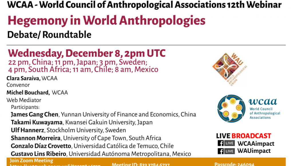 Nuestro académico, Gonzalo Díaz Crovetto, Director del Magister en Antropología e Investigador asociado al Neii (Núcleo de Investigación en Estudios Interculturales e Interétnicos) de la UC Temuco participará en el Webminario titulado “Hegemony in World Anthropologies “ el día 8 de Diciembre del 2021 a las 11 hrs de Chile.