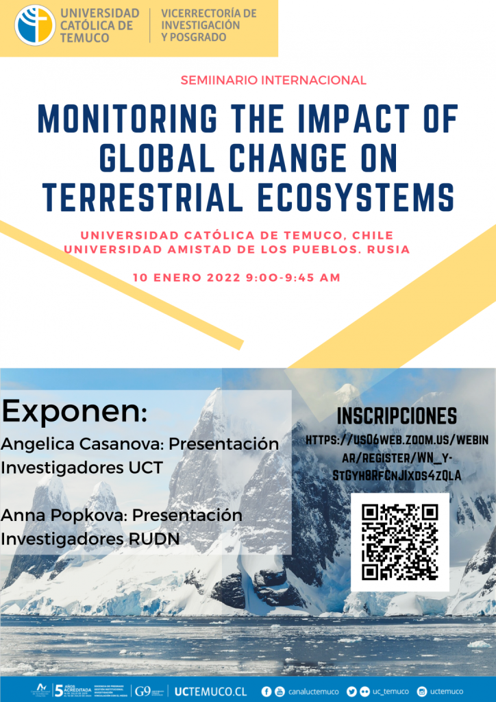 La Universidad Católica de Temuco, Chile, y la Universidad Amistad de los Pueblos, Rusia, organizan este seminario con la finalidad de difundir a la comunidad científica las investigaciones referentes a el avance de el cambio climático, en temáticas de agua, vegetación y planificación territorial. La actividad se ha programado para el día 10 de enero del 2022 a las 09:00 hrs. a través de la plataforma Zoom.