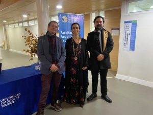 En la presentación del Magíster en Creación Transdisciplinar la Decana de la FAAD hizo entrega de tres becas por parte de la Universidad Católica de Temuco a estudiantes con excelencia académica de las carreras de Arquitectura, Diseño y Arte, que recayó en Eduardo Cornejo, Vania Gajardo y Dina Rodríguez respectivamente.