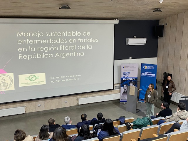 La charla magistral con la que se dio inicio a las Jornadas estuvo a cargo de la Dra. Andrea Leone y la Dra. Silvana Seta de la Universidad Nacional de Rosario y trató sobre “Manejo sustentable de enfermedades en frutales en la región litoral de la República Argentina”.